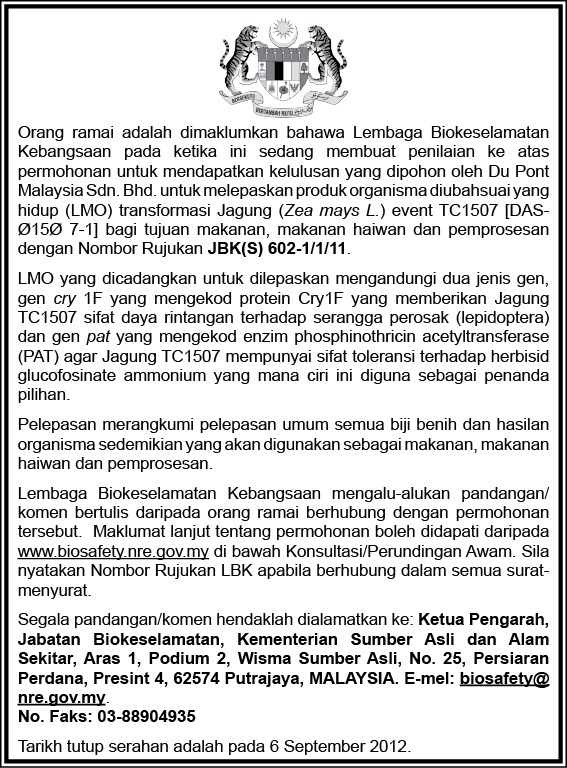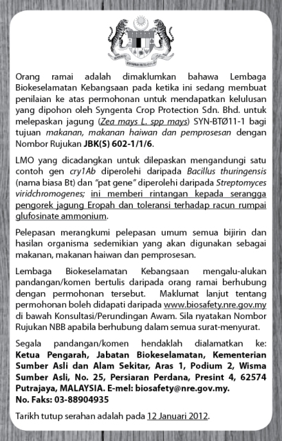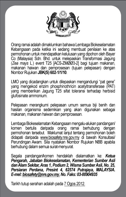 PERMOHONAN UNTUK MENDAPATKAN KELULUSAN BAGI PELEPASAN PRODUK JAGUNG BT11 BAGI TUJUAN PEMBEKALAN ATAU TAWARAN UNTUK MEMBEKALKAN