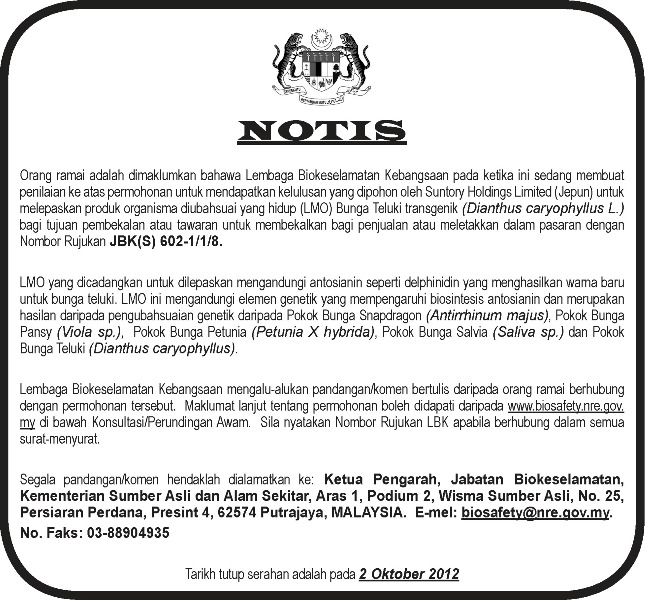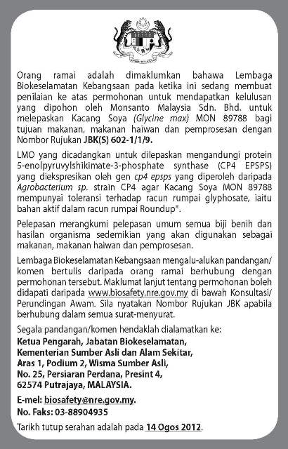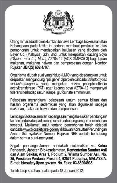 PERMOHONAN UNTUK MENDAPATKAN KELULUSAN BAGI PELEPASAN PRODUK KACANG SOYA A2704-12 BAGI TUJUAN PEMBEKALAN ATAU TAWARAN UNTUK MEMBEKALKAN