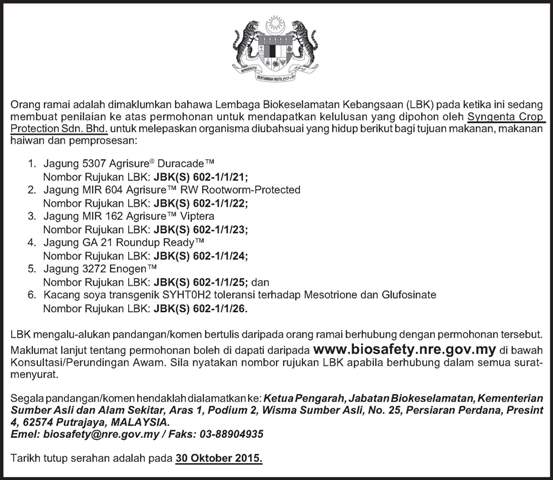 PERMOHONAN KELULUSAN UNTUK PELEPASAN PRODUK JAGUNG MIR162 UNTUK PEMBEKALAN ATAU TAWARAN PEMBEKALAN BAGI JUALAN ATAU PENEMPATAN DALAM PASARAN