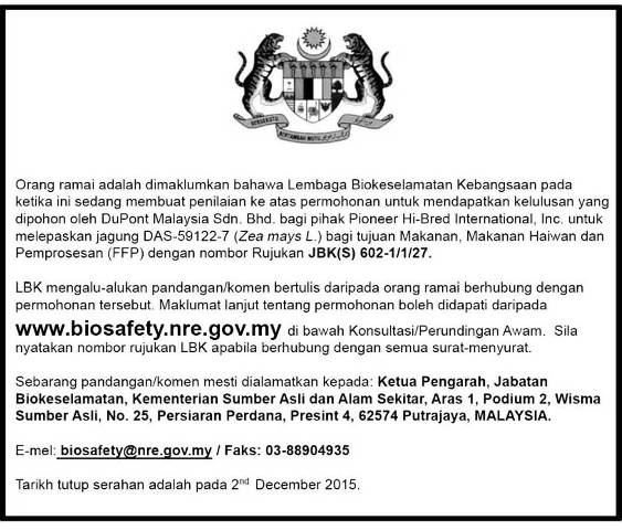 PERMOHONAN KELULUSAN UNTUK PELEPASAN PRODUK JAGUNG MIR604 UNTUK PEMBEKALAN ATAU TAWARAN PEMBEKALAN BAGI JUALAN ATAU PENEMPATAN DALAM PASARAN