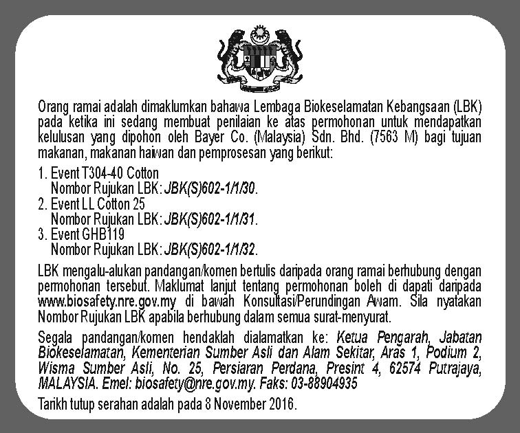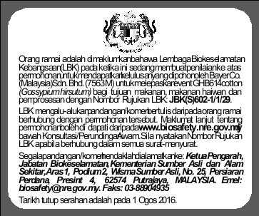 PERMOHONAN UNTUK KELULUSAN BAGI PELEPASAN PRODUK KAPAS GHB614 UNTUK PEMBEKALAN ATAU TAWARAN UNTUK MEMBEKALKAN BAGI JUALAN ATAU PERLETAKAN DALAM PASARAN
